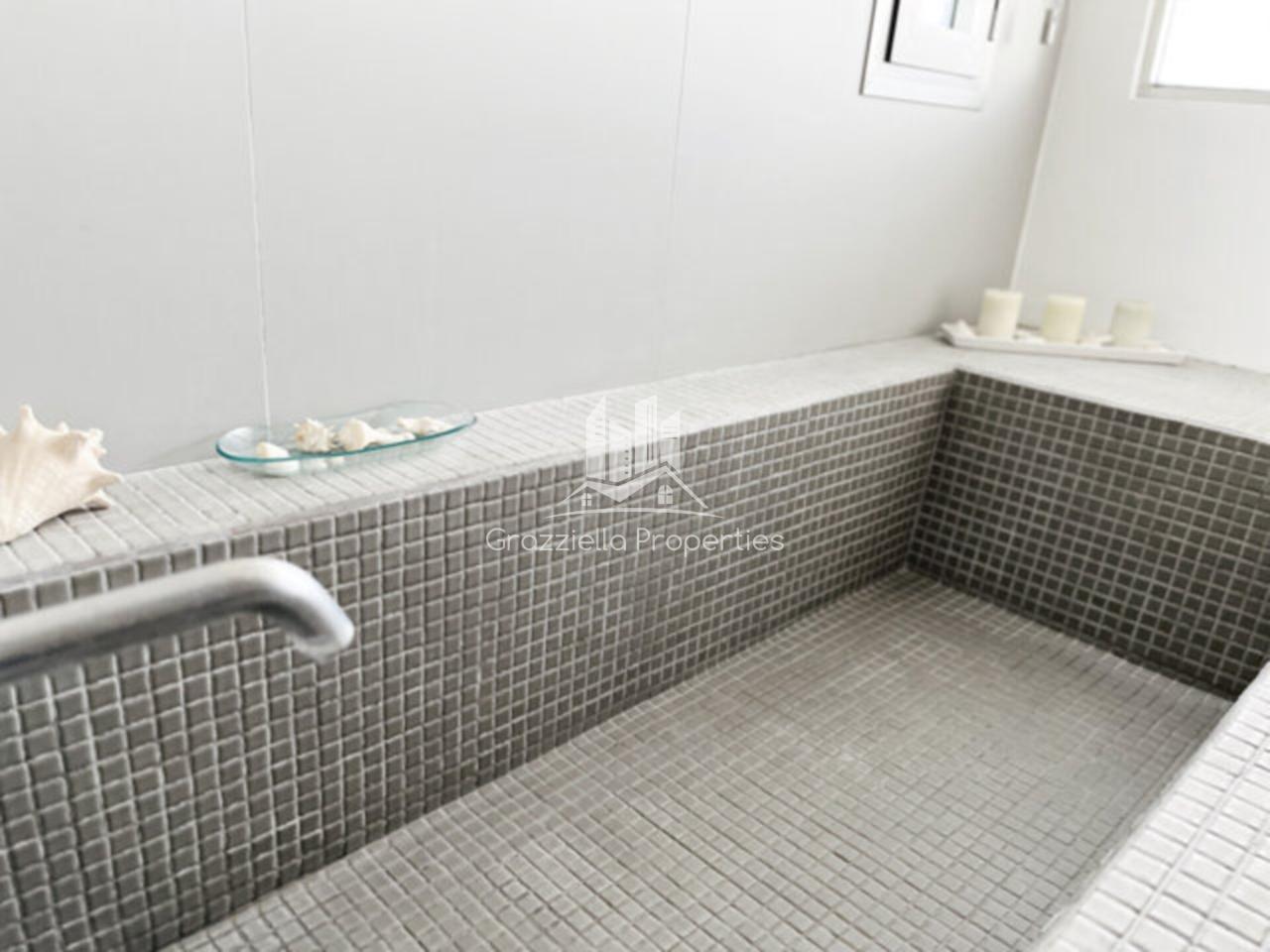 Piscina climatizada de agua salada, de líneas rectas y diseño elegante.