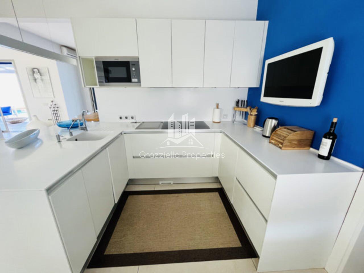 Cocina abierta de diseño, completamente equipada, conectada de forma discreta con la zona de lavandería, plancha y despensa.